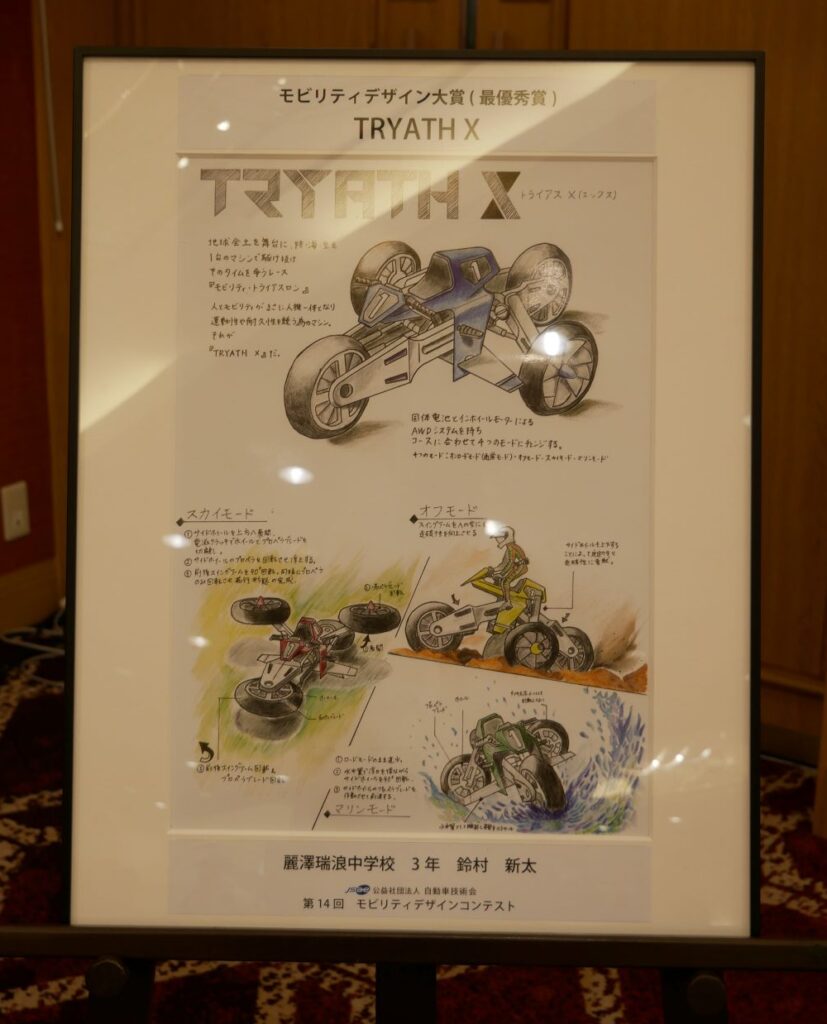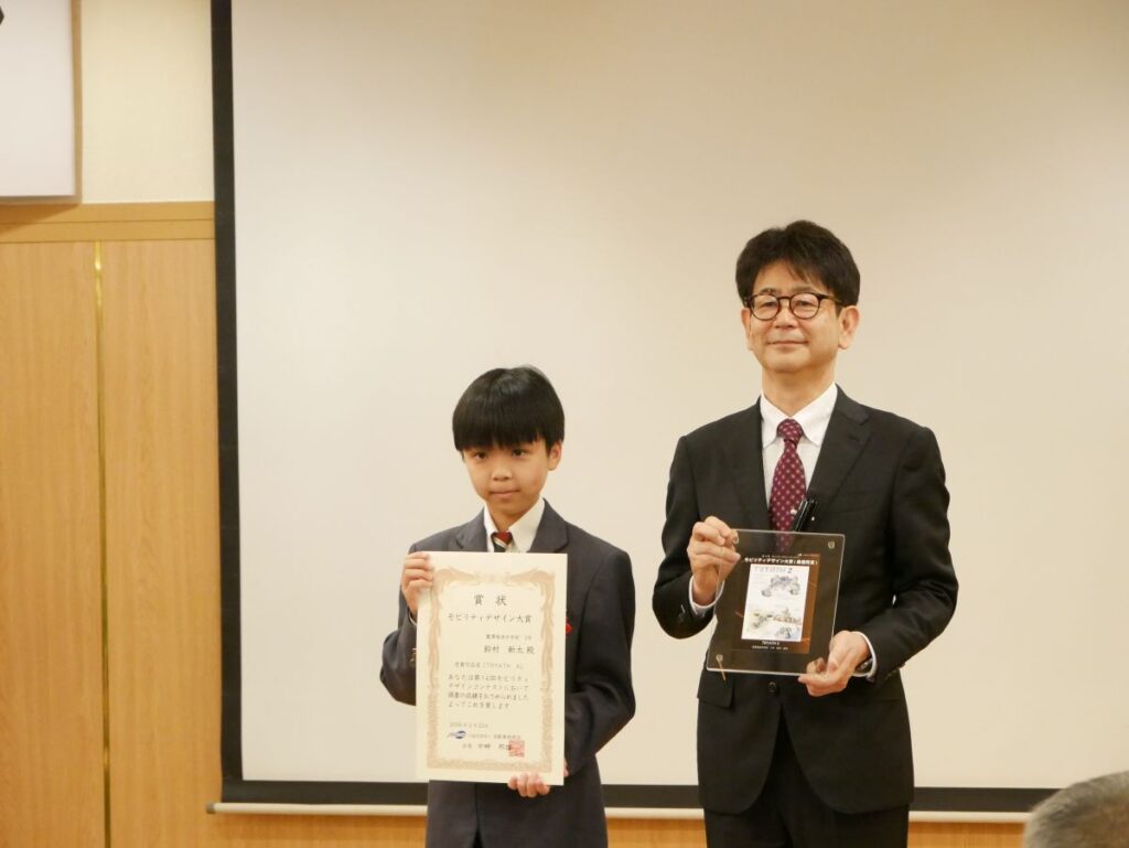 2026年3月23日(月)、アルカディア市ヶ谷にて「第14回モビリティデザインコンテスト」の表彰式が行われました。この表彰式には、最優秀賞である「モビリティデザイン大賞」を受賞した本校中学3年生の鈴村新太さんが参加しました。