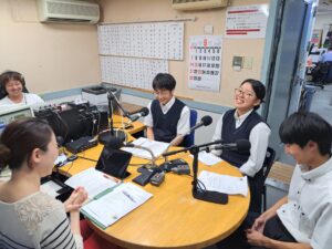 初めてラジオ局のスタジオに入った経験は新鮮で、生徒たちにとって大変貴重な機会となりました。なお、番組のディレクターを務める梅田さんは本校の卒業生でもあります。